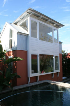 Conceived of as a little pavilion it was not to dominate the existing dwelling and care was taken to manipulate the scale by duplicating the pitched roof while the volume of the office is shaped by the tall south window. The scale is further reduced by using the corrugated cladding to the first-floor walls.